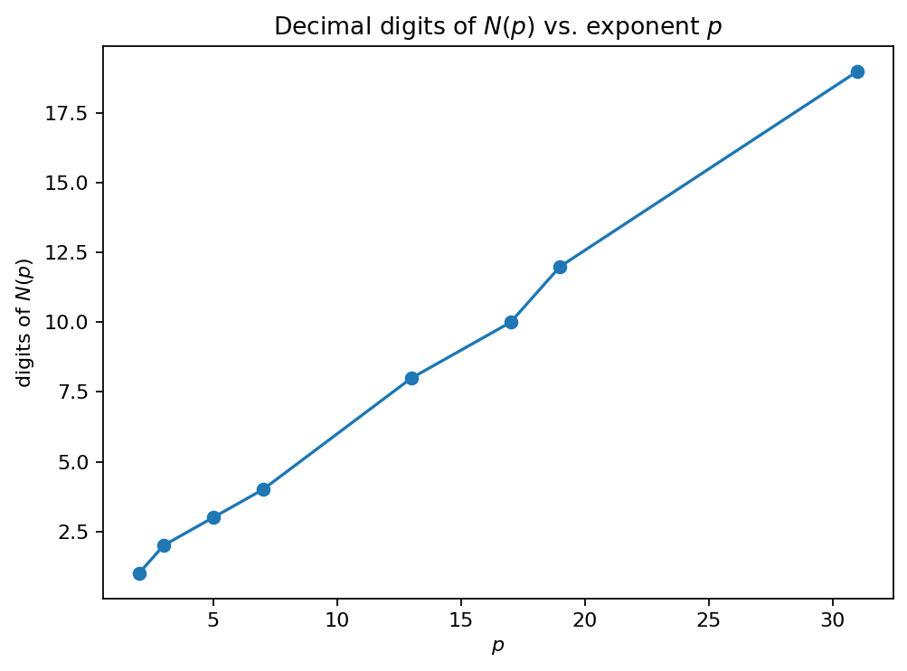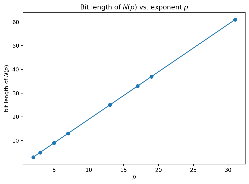 int.bit_length()for stable bit length (fast and exact).Keep the exponent list modest for fast docs builds; this is a growth experiment, not a search for new Mersenne primes.