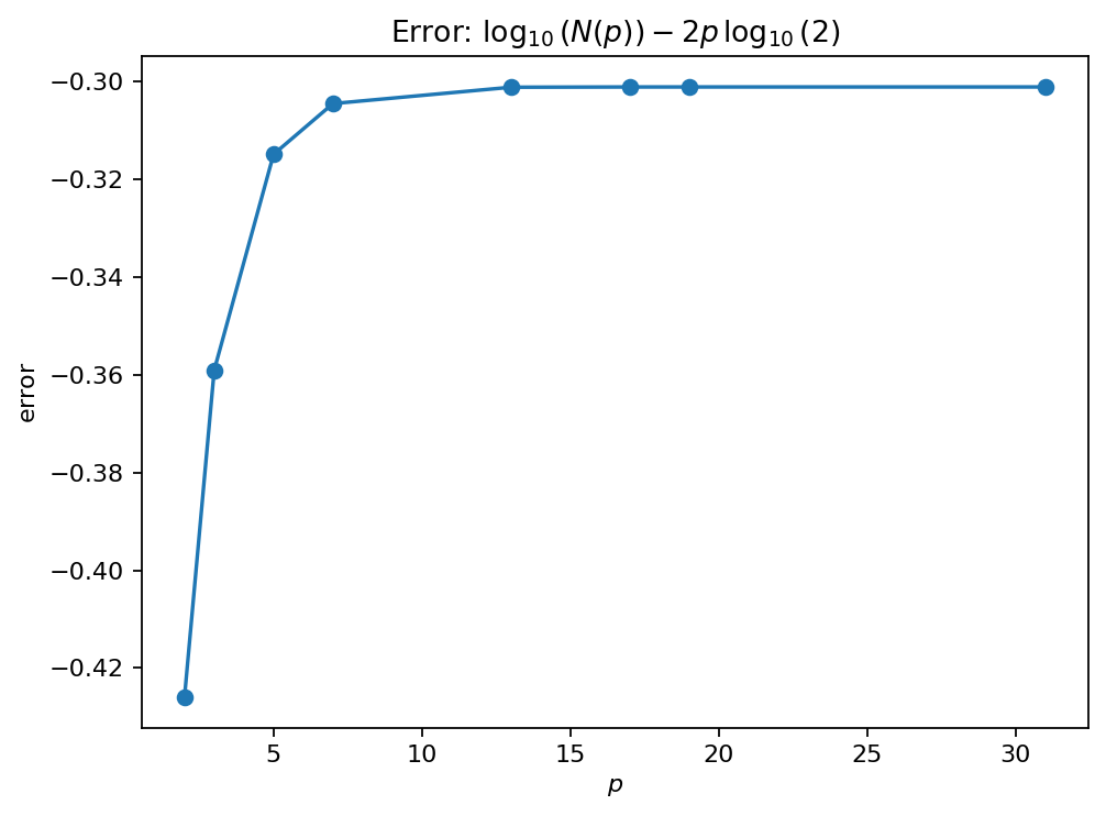 Test the approximation \(\log_{10}(N(p)) \approx 2p\log_{10}(2)\).