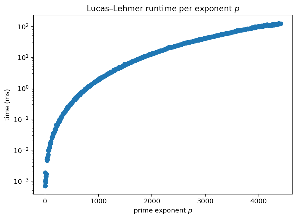 Record (at minimum): \(p\), pass/fail, final residue, and wall time.