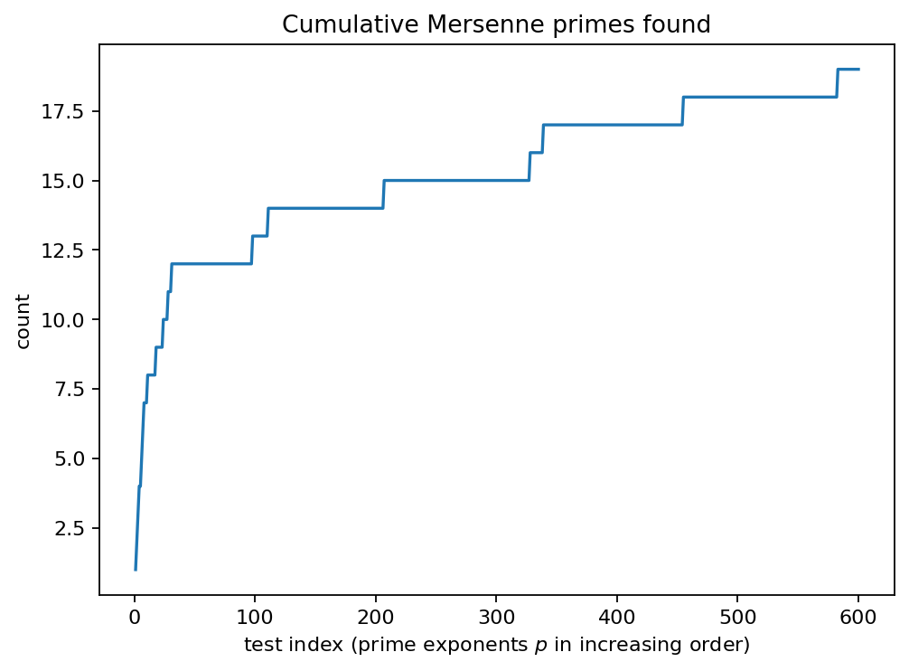 Empirically explore Mersenne primality testing by scanning prime exponents \(p\) and applying the Lucas–Lehmer test to \(M_p = 2^p - 1\).