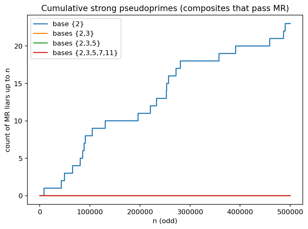 Using too few bases creates rare-but-real false positives (strong pseudoprimes).