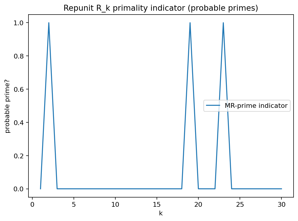 Repunit numbers grow fast; this experiment uses Miller–Rabin for a probable-prime indicator.