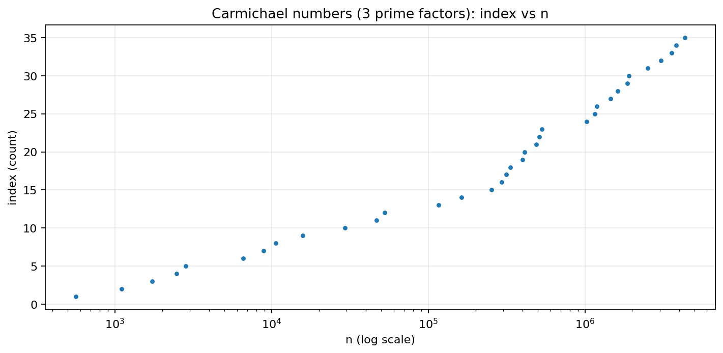 E048: Carmichael numbers: Korselt scan + Fermat counterexamples¶