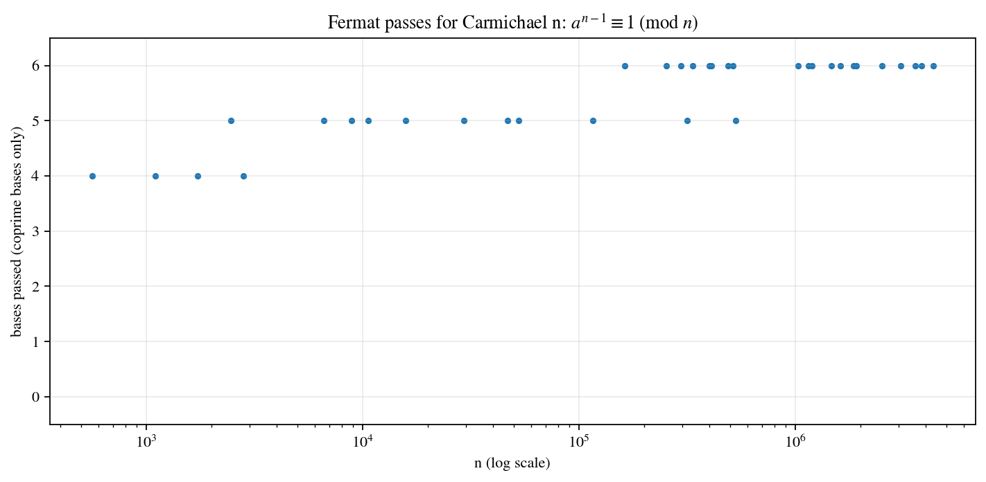 Seeing “all bases passed” in the plot is a strong reminder: Fermat alone is not a reliable primality test.