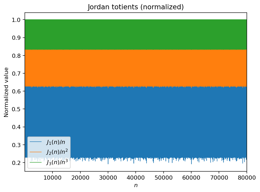 How do the normalized Jordan totients \(J_k(n)/n^k\) behave for k=1..3?