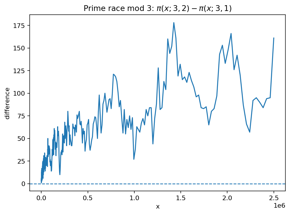 Another small prime race compares the two reduced residue classes modulo 3: