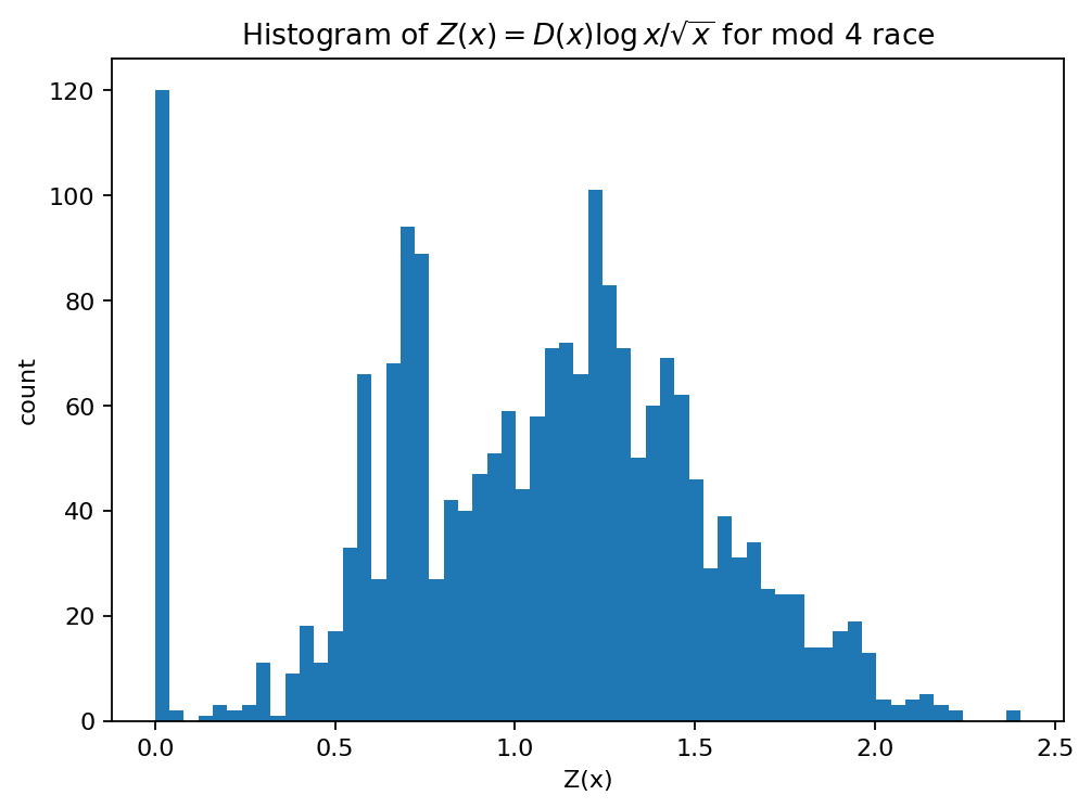 E075: Prime race statistic: distribution on a log-grid.¶