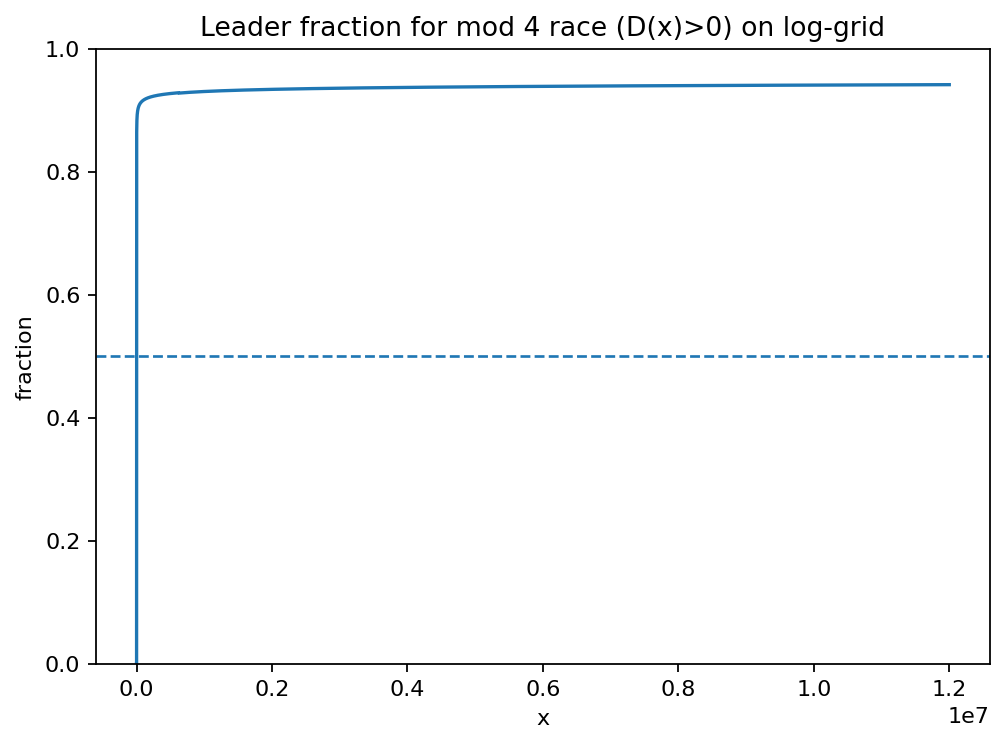 For the mod 4 race D(x)=π(x;4,3)-π(x;4,1), define the empirical leader fraction:
