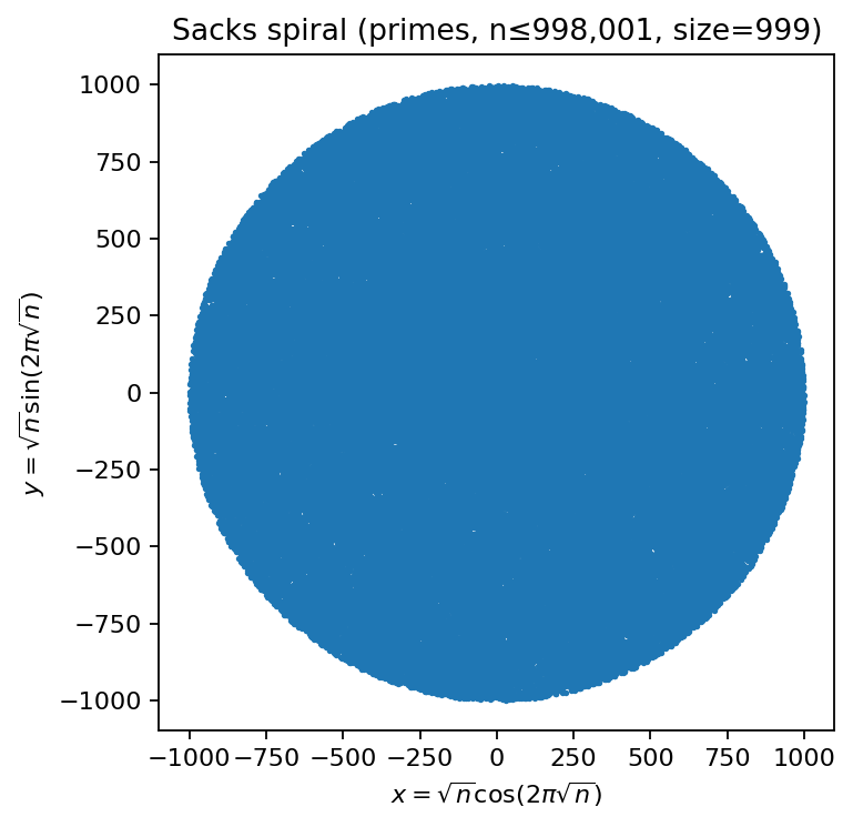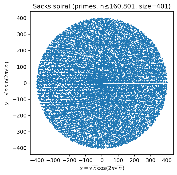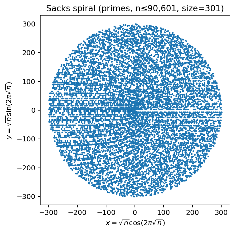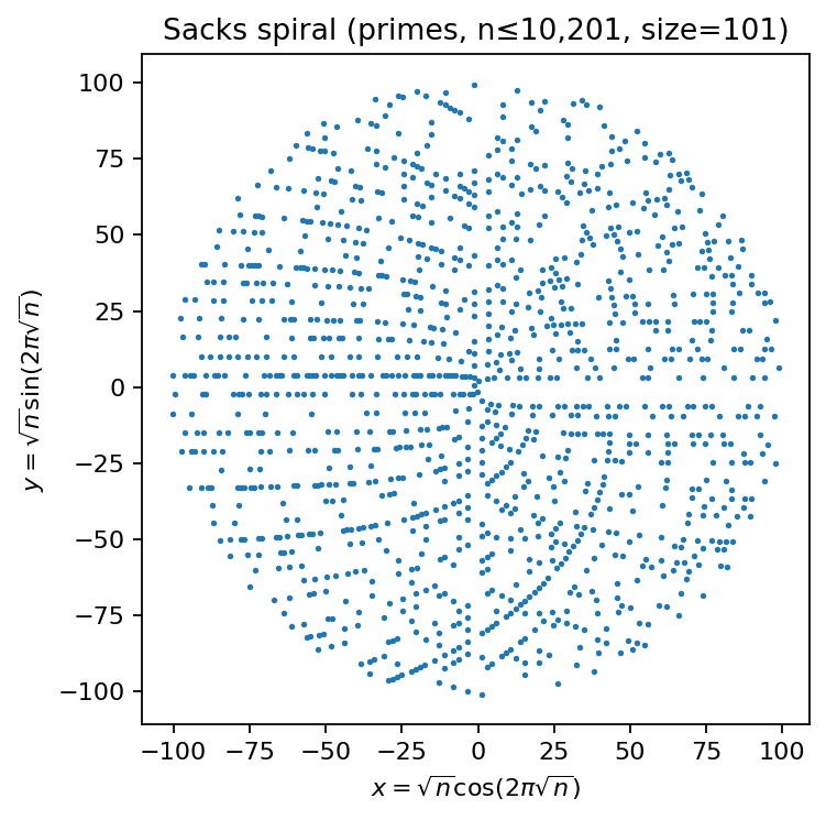 Computation: for integers \(1,\dots,\text{size}^2\), compute a prime mask; map prime indices to \((x,y)\) via the Sacks rule.
