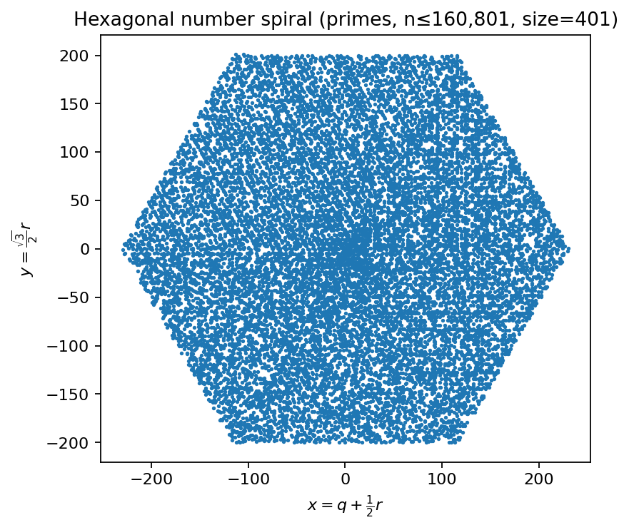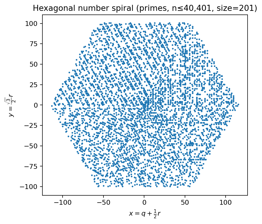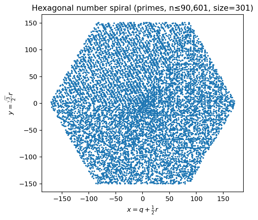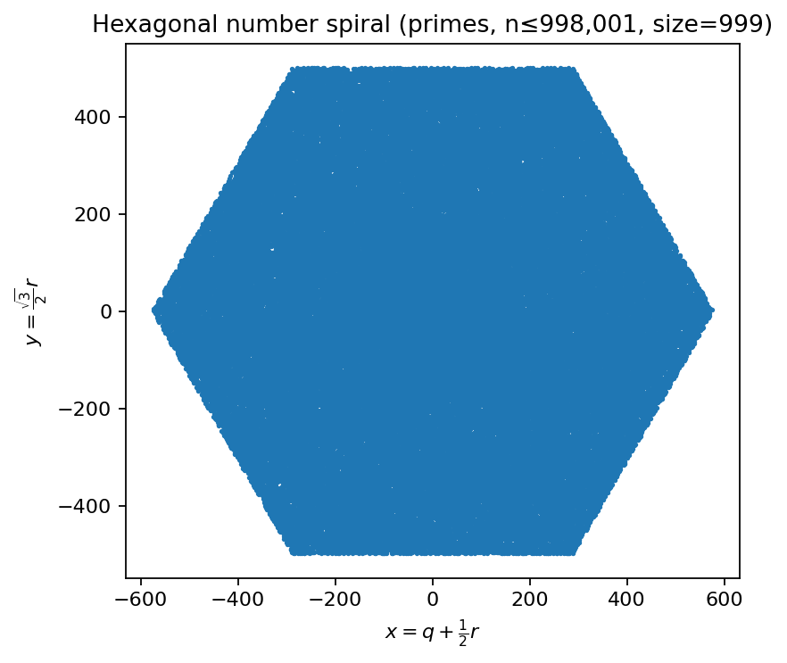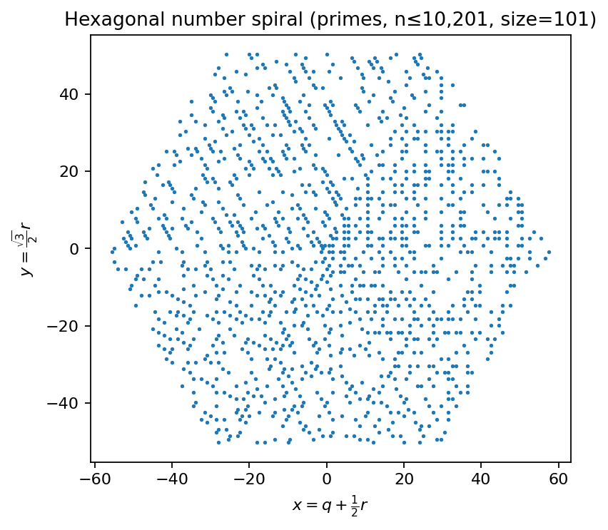 Coordinates: integers are mapped to axial hex coordinates \((q,r)\) on a hex grid and embedded into the plane via \(x = q + \tfrac{1}{2}r\) and \(y = \tfrac{\sqrt{3}}{2}r\).